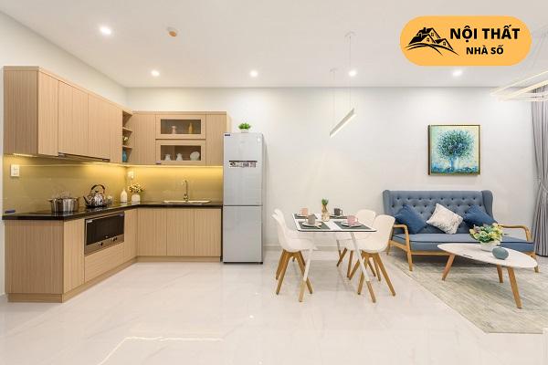 Sự kết hợp giữa phòng khách chung không gian với khu bếp sẽ giúp tiết kiệm diện tích và tạo sự ấm cúng. Tuy nhiên với căn hộ diện tích mini chúng ta nên lược bớt đảo bếp thay vào đó là đặt một bộ bàn ghế ăn hiện đại kế bên bếp.